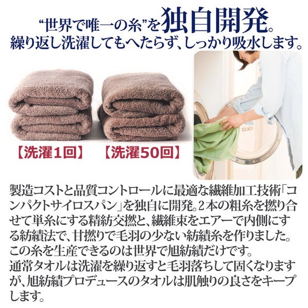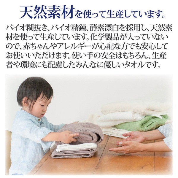 女性や子供のお肌は大変デリケート。毎日使うタオルにもこだわっていたいものです。本製品は、うっとりするような柔らかい肌ざわりと、毎日の洗濯にもへこたれない究極の耐久性を実現した高級タオルです。糸のプロである泉州地区の紡績会社がプロデュースしたタオルで、糸を紡ぐことから全て日本の泉州で作られてます。糸からこだわり、糸の特性を生かせるのも紡績業ならではで、他のタオル工場からは生まれなかった「究極の肌触り」と「耐久性」を楽しめます。糸は、全世界コットン生産量0.5%未満と大変貴重な「ピマ綿」を特殊な紡績法を用いて紡ぎ、タオルに作り上げるという贅沢さ。高級ホテル仕様の上質な柔らかさを生み出し、その滑らかな肌触りは、肌や髪の毛をやさしく包み込みます。