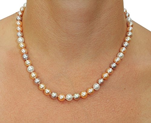 This necklace is a gorgeous 7-8mm Freshwater Multicolor strand that includes a variety of pearl colors including pink, peach, and white of our top quality AAAA pearls. The pearl necklace is a beautiful mixture of colors and comes affixed with a 14K gold clasp in either white or yellow gold. All products are shipped in an elegant jewelry box, creating a truly beautiful presentation.
