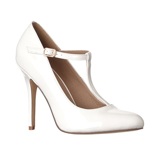 -. Feature : Classic, timeless design in a comfortable, stiletto high heel T-Strap pump that you won't want to take off. / Closed, round toe design with a padded insole and additional design elements to ensure maximum comfort. / Heel height measures 4". Platform height measures 0.10". (Measurements are very close approximations) / Nearly 10 color / material choices! Options include faux leather and faux patent leather each with a variety of color options. / Available in women's US standard width shoe sizes: 6, 6.5, 7, 7.5, 8, 8.5, 9 & 10