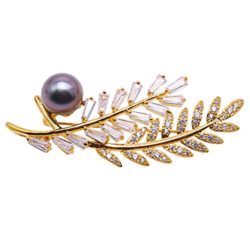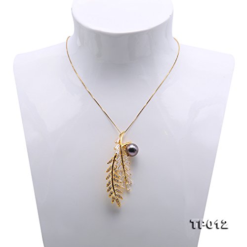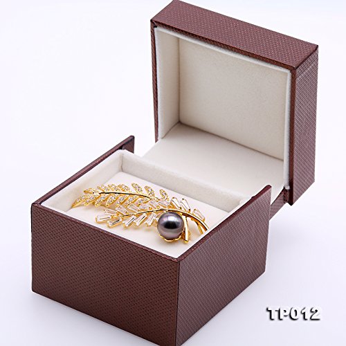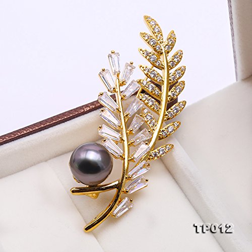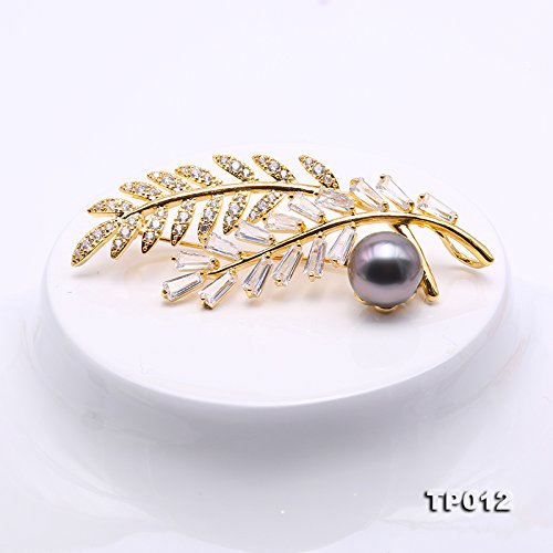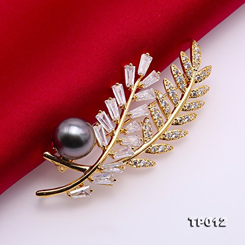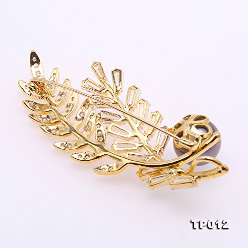 Description *Gorgeous Tahitian pearl brooch with golden-tone feather design. The brooch is inlaid with sparkling zircons, with a 12 mm black Tahitian pearl. The high quality pearl has perfectly round shape, smooth skin, and strong lustre.