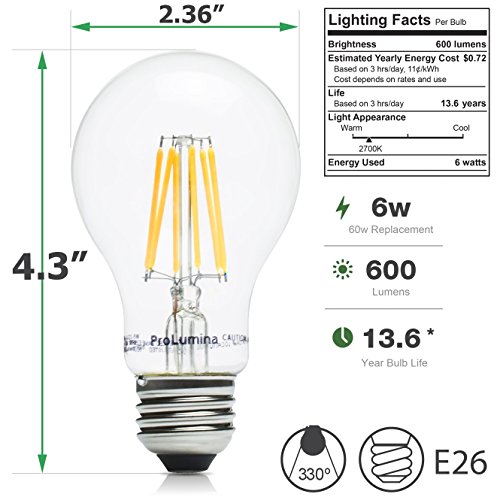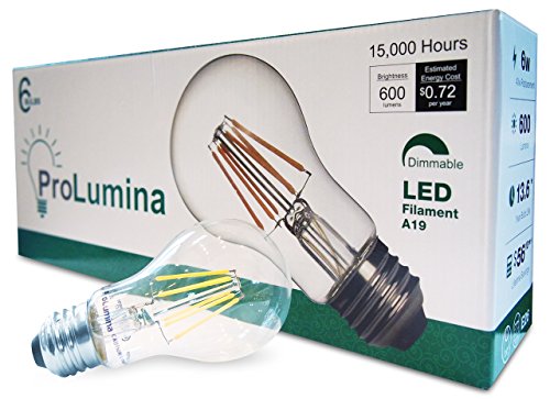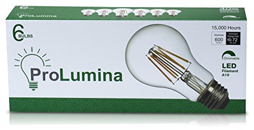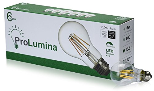 ProLumina Pack of 6 A19 LED Filament 40 Watt Equivalent Dimmable Warm White Light Bulb, E26 Base, 2700K