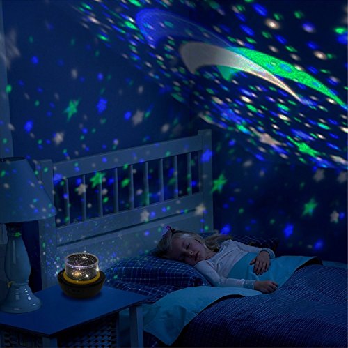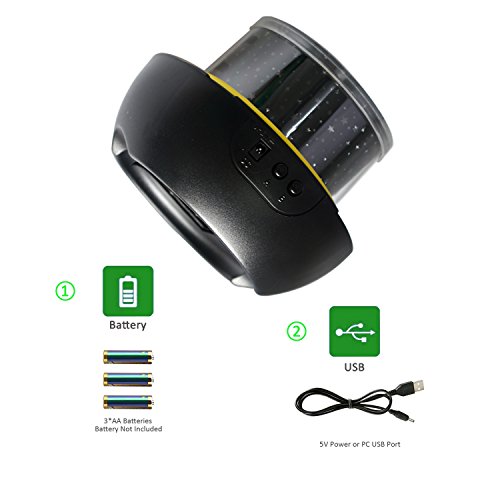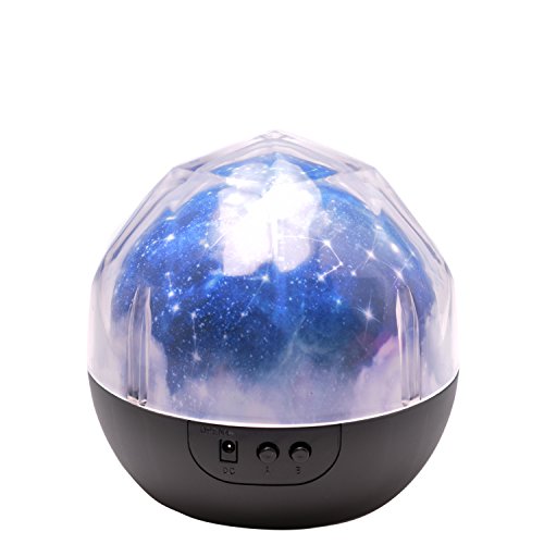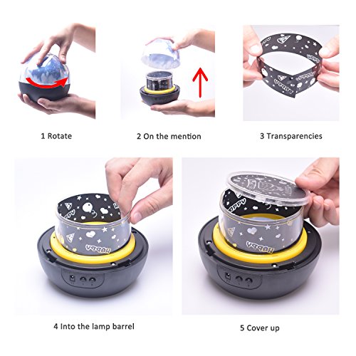 Three Optional Films---with three different theme: universe, Starry star and Happy Birthday. Thus light will be projected to ceiling or wall, and press the button B for 3 second then the light will rotate.