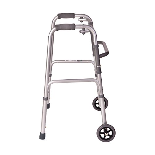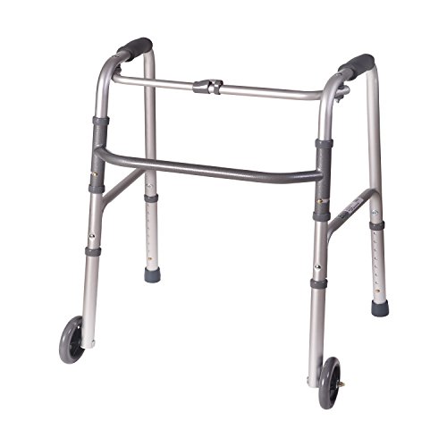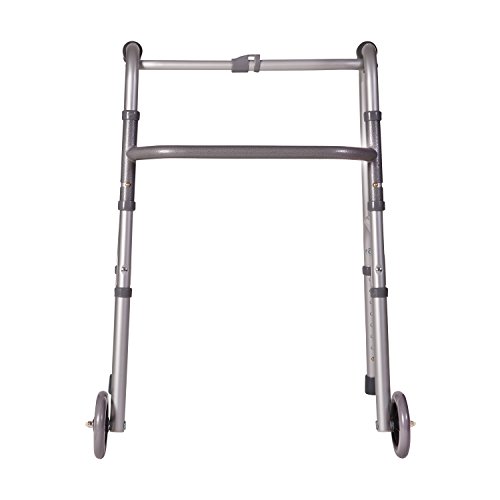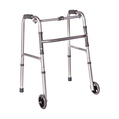 This beautiful, lightweight walker will be a great support and help you keep your balance as you walk around your house or outside. The silver metallic color is eye catching and will help you look your best wherever you go. Constructed of strong anodized aluminum, the walker can support up to 250 pounds. The handgrips are soft molded foam which will feel comfortable in your hand. The 5-inch wheels glide across most surfaces and the slip-resistant rubber tips give you a firmer grip on the floor or pavement. The walker is also adjustable 32 to 38 inches, meaning it will be a good fit for most people. Features - This eye-catching walker will not only support you and help you keep your balance, but it looks nice, too!