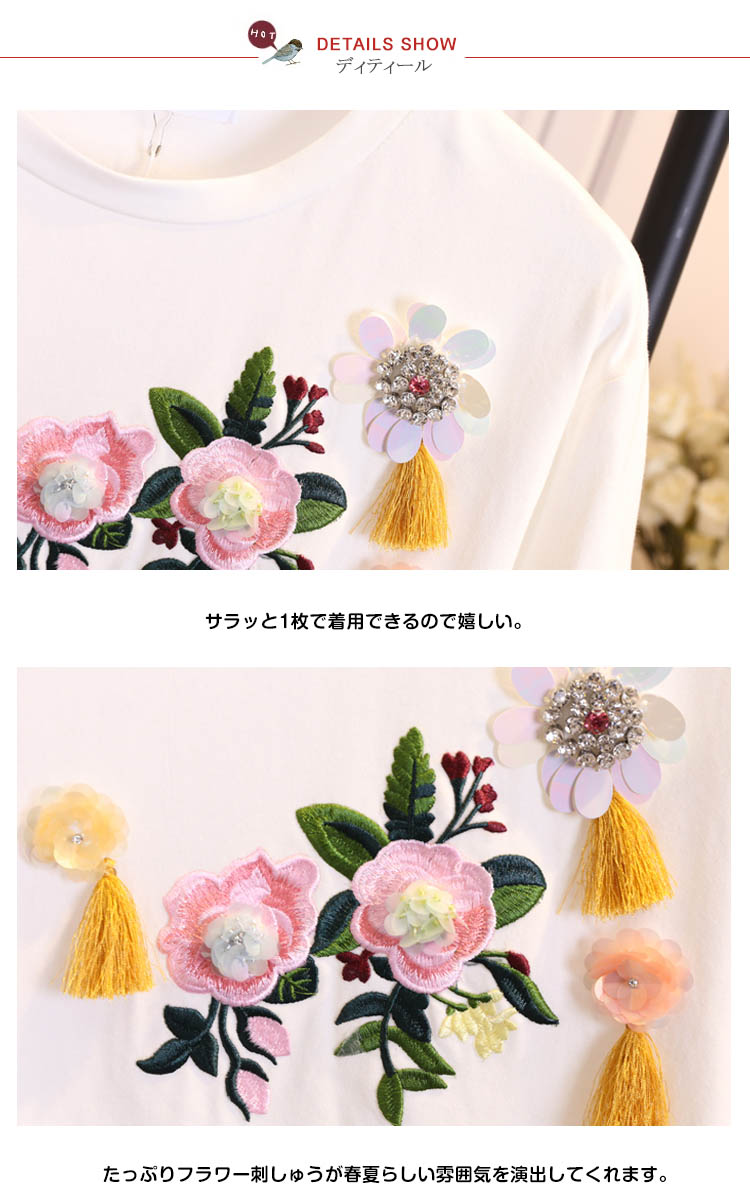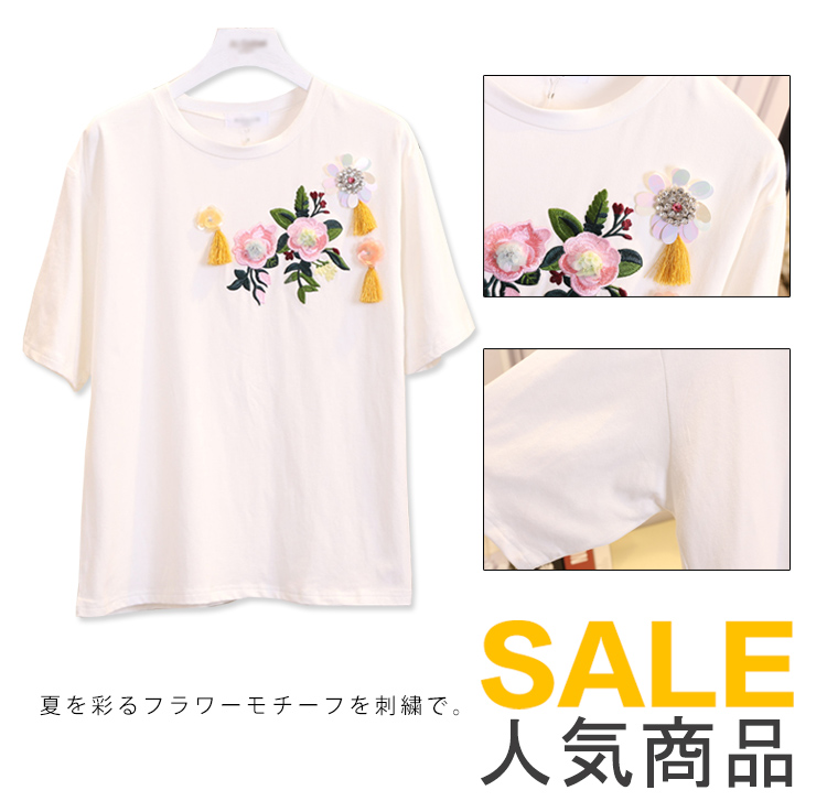 | 夏を彩るフラワーモチーフを刺繍で。お洒落な雰囲気を放つゆるtシャツの登場です。たっぷりフラワー刺しゅうが春夏らしい雰囲気を演出してくれます。サラッと1枚で着用できるので嬉しい。肌ざわりの優しいコットン素材が気持ちよく◎これからのシーズンに大活躍してくれそう。 | |