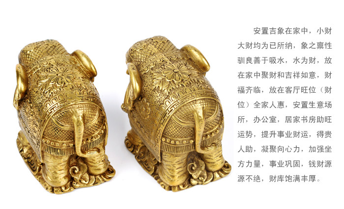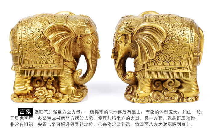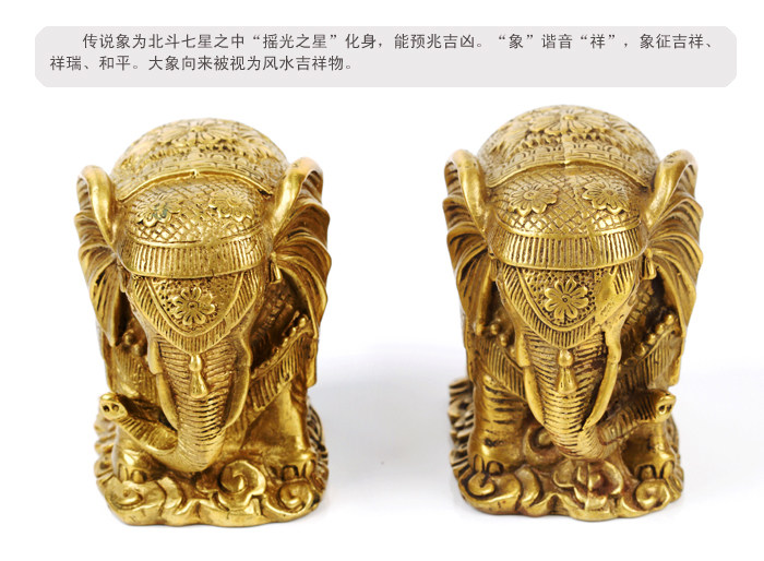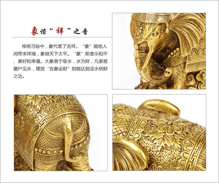象谐"祥"之音,传统习俗中,象代表了吉祥。"象"能给人间带来祥瑞,象微天下太平。"象"即表示和平、美好和幸福。大象力大魁武,性灵却温和柔顺,能兆灵瑞,大象善于吸水,水为财,摆放"吉象运财"则能达到汲水纳财之功。