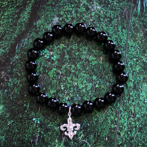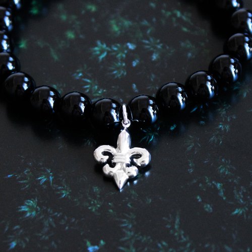 - Title : Black Onyx Beads Stretchable Bracelet with 925 Sterling Silver Fleur De Lis