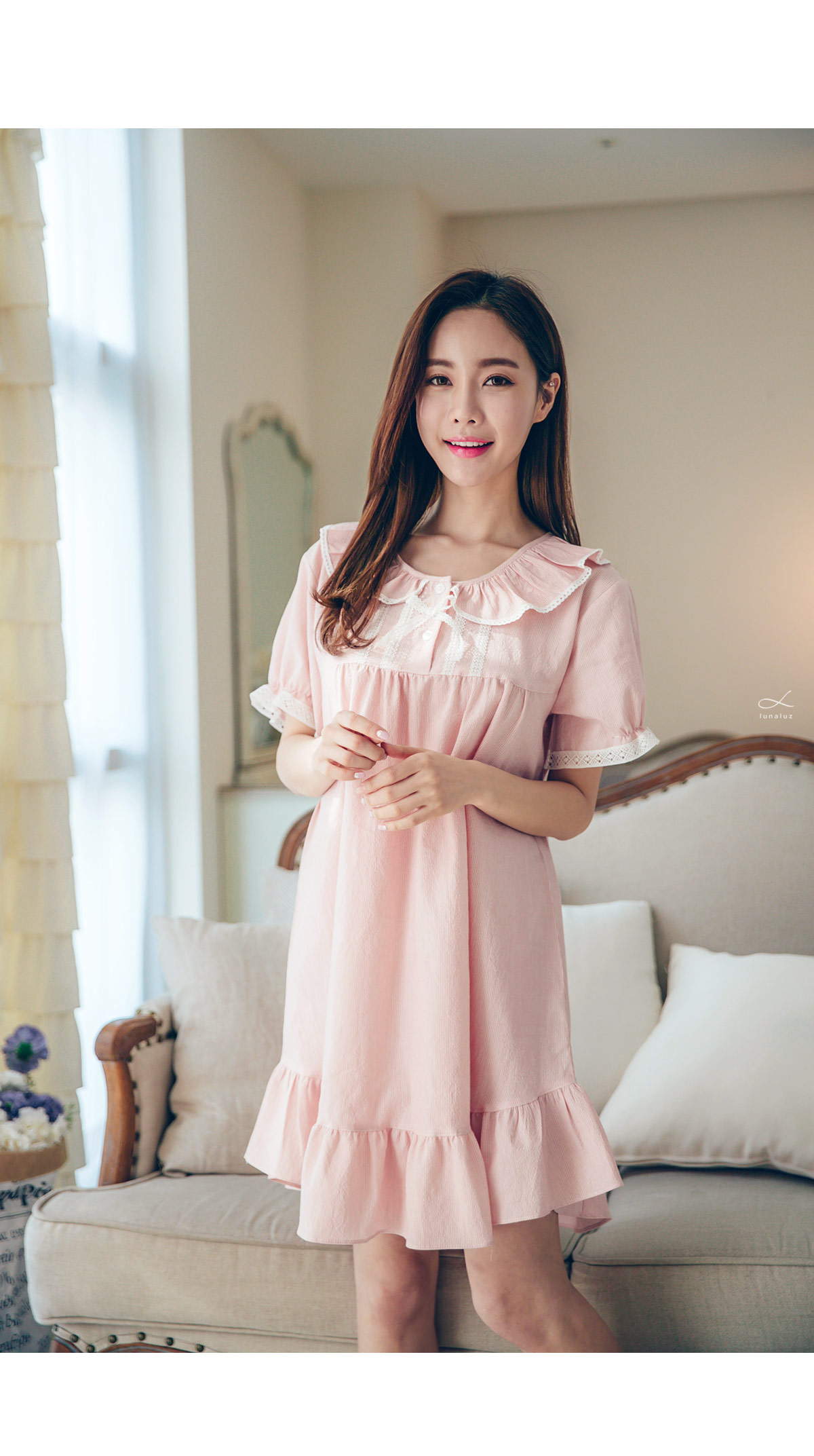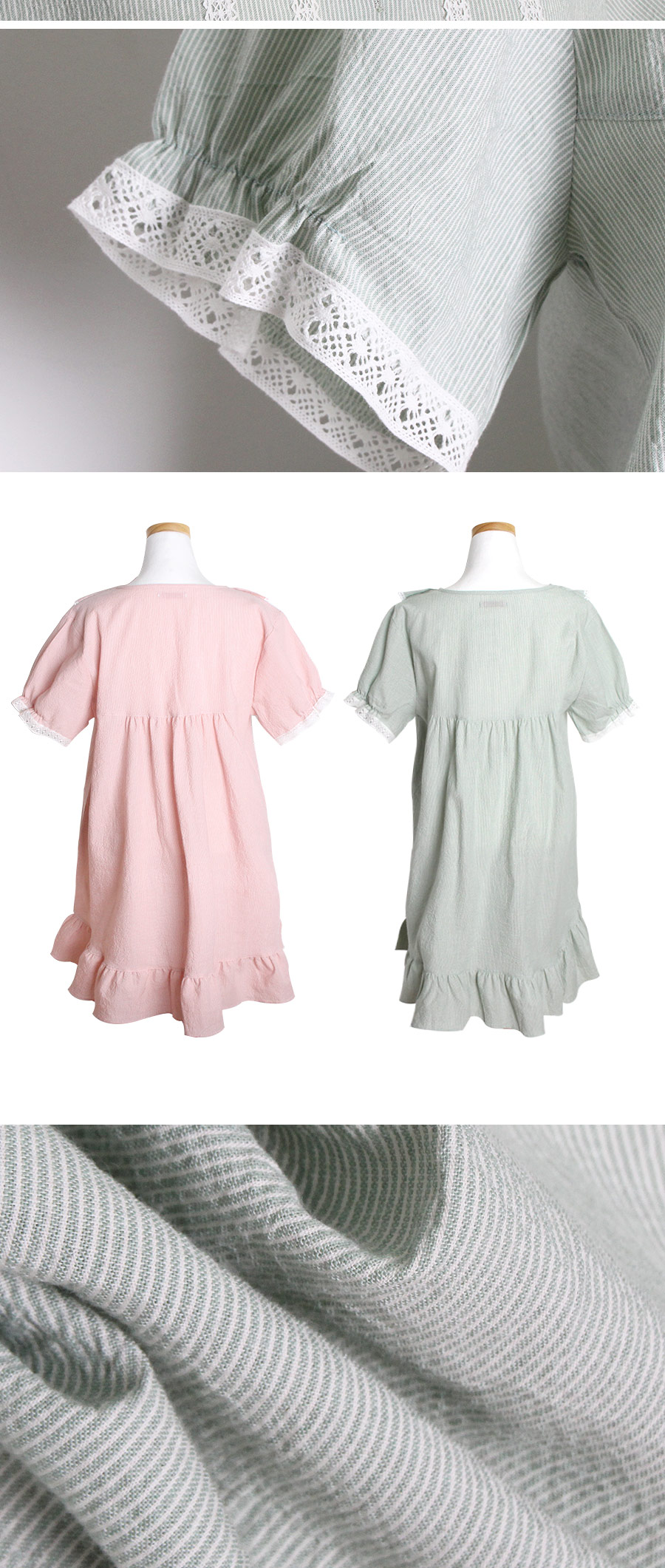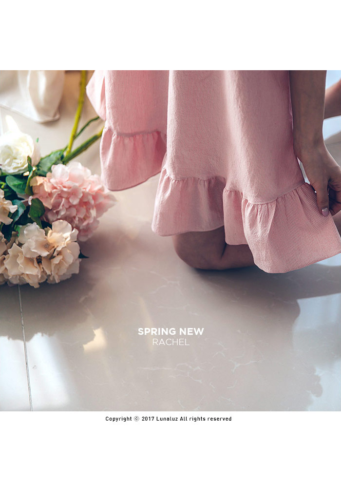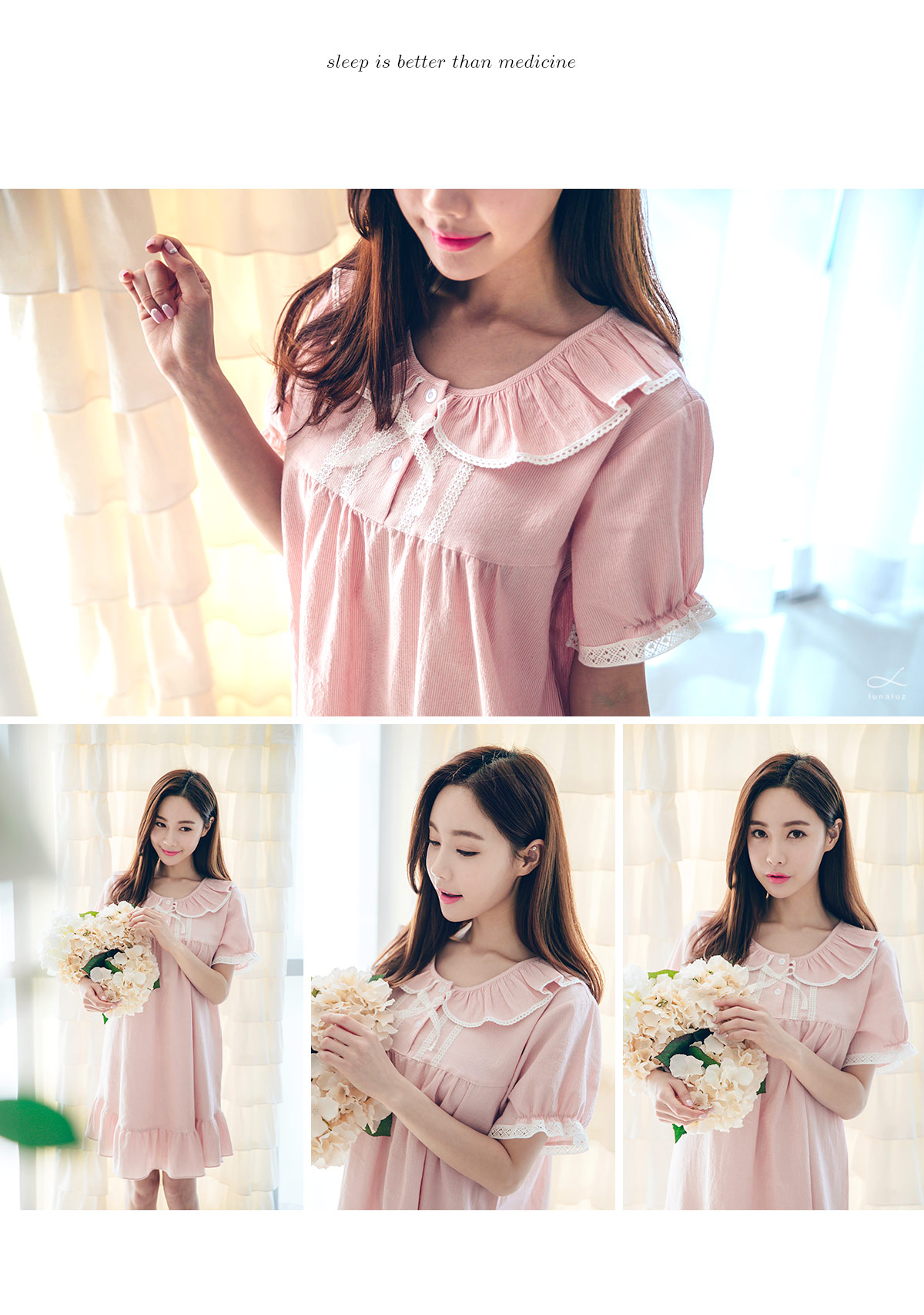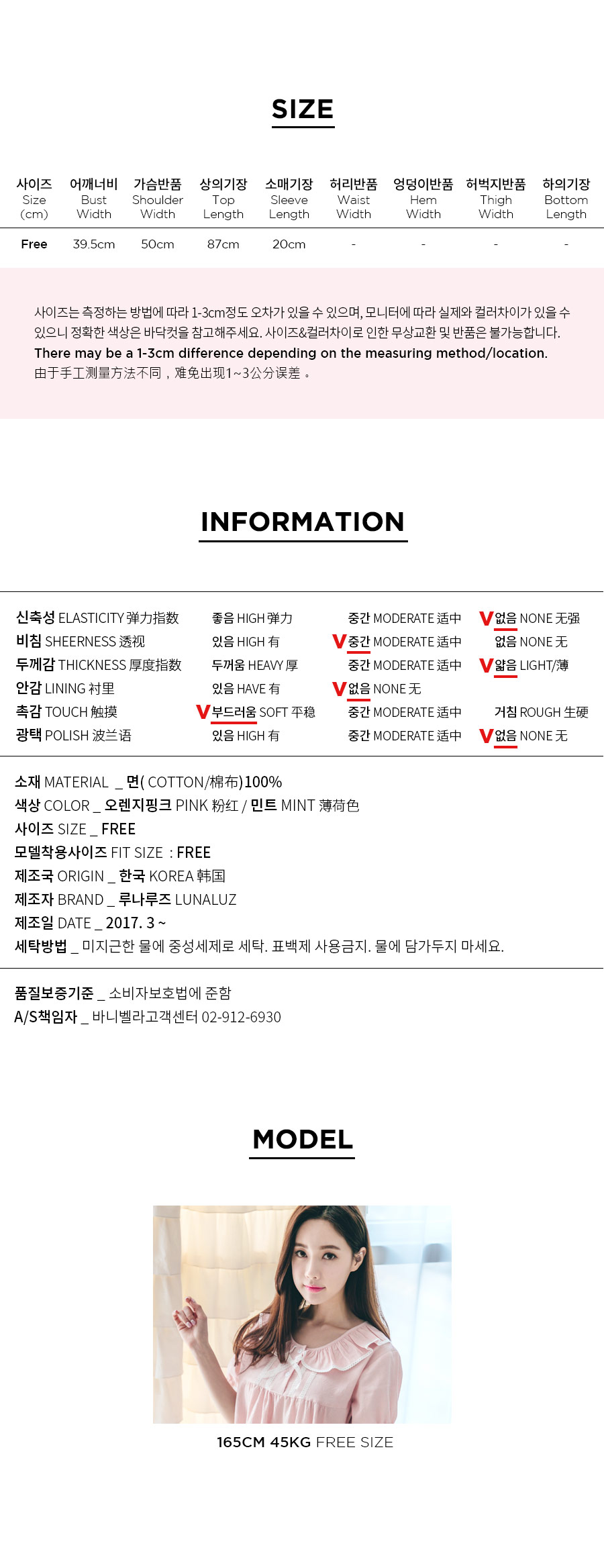산뜻하면서 러블리한 디자인과 원단이 어우러진 ‘레이첼’ 미니 원피스 잠옷이에요: ) 탄탄한 소재와 심플하면서 부드러운 느낌의 핑크톤의 스트라이프로 cozy한 홈웨어룩을 연출하기 좋습니다. 스트라이프로 포인트를 주어 슬림 해 보이는 효과를 주며 실을 직접 염색하여 짠 선염 면 조직으로 세탁하여도 흐트러짐 없는 원단의 고급스러움을 느끼실 수 있습니다. 사이즈는 free사이즈로 평소 44반~66size까지 입으실 수 있는 패턴입니다. 여리하면서 소녀스러운 느낌을 내어주는 적당한 네크 라인과 단정하면서 러블리한 스타일의 원피스 잠옷이에요. 네크 라인에 살짝 넓은 프릴 장식과 끝 부분에 레이스를 달아주어 얼굴 빛이 더 화사해 보여요. 클로징 버튼 부분에도 세로 레이스 장식을 여러 줄기 달아주어 러블리함을 배로 살려주었어요. 가운데 레이스 리본 장식으로 마무리 하였습니다. 소매는 살짝 볼륨감 있게 떨어지도록 제작하여 전체적인 분위기에 걸맞는 느낌을 내어줍니다. 소매 양 사이드 부분에 밴딩을 넣어 소매가 예쁘게 잡아지도록 세심하게 디자인 하였어요. 살짝 A라인으로 퍼지는 미니 기장의 원피스 스타일로 정말 귀여워요~ 소재가 탄탄하고 핏을 잘 잡아주어 실루엣이 사랑스러워요.^^ 100%국내 제작으로 소재가 좋고, 봉제선이 깔끔하며 디자인에 퀄리티를 높여주었습니다.