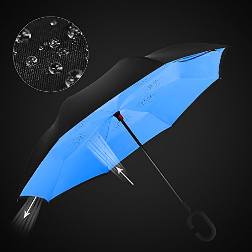 DOUBLE LAYER: inverted umbrella made of: pongee cloth, durable fiberglass ribs and double layer ribs make the cars umbrella more sturdy, enhance its windproof effect