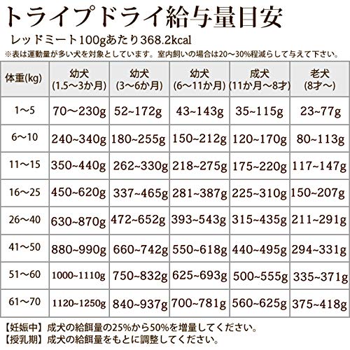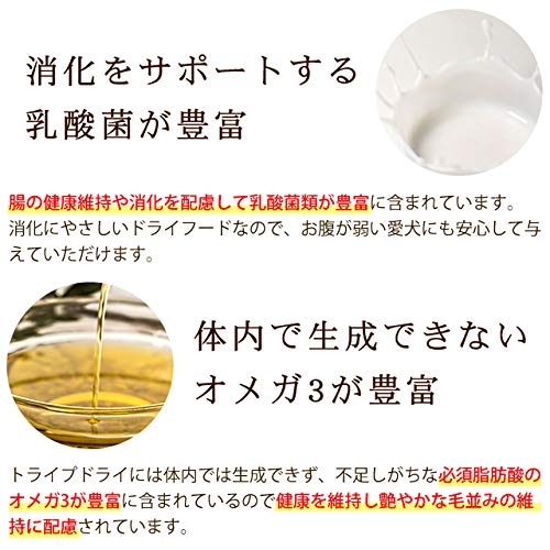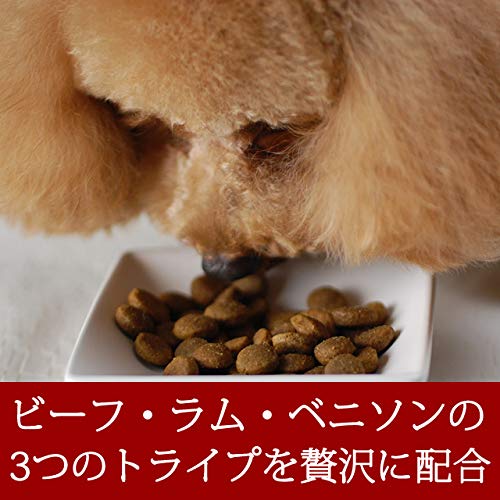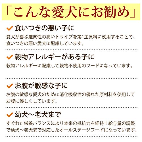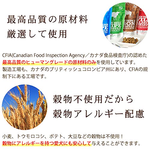 原材料:ビーフトライプ、ラムトライプ、ベニソントライプ、牛肉、ラム肉、ラムミール、ニシンミール、豚肉ミール、羊肉ミール、魚(サーモン)ミール、赤レンズ豆、緑レンズ豆、ヒヨコマメ、エンドウ豆澱粉、サツマイモ、エンドウ豆、豚脂肪、亜麻仁、エンドウ豆ファイバー、, 魚油、カボチャミール、黒豆、カボチャ、ホウレンソウ、にんじん、ブロッコリー、クランベリー、リンゴ、ブルーベリー、バナナ、天然香料、亜鉛タンパク化合物、鉄タンパク化合物、銅タンパク化合物、マンガンタンパク化合物、ビタミンA、ビタミンD3、ビタミンB12、ビタミンE、ナイアシン、リボフラビン、硝酸チアミン、塩酸ピリドキシン、葉酸、酸化マンガン、, ヨウ素酸カルシウム、亜セレン酸ナトリウム、炭酸カルシウム、塩化ナトリウム、塩化カリウム、塩化コリン、乾燥ラクトバチルス・アシドフィラス発酵物、乾燥ラクトバチルス・カゼイ発酵物、乾燥ビフィズス菌ビフィダム・サーモフィラム発酵物、乾燥ストレプトコッカス・フェシウム発酵物、ユッカシジケラ、ローズマリー、唐辛子、ペパーミント、タイム、緑茶抽出物