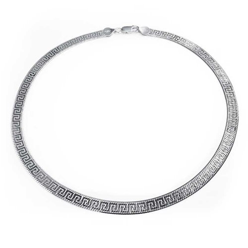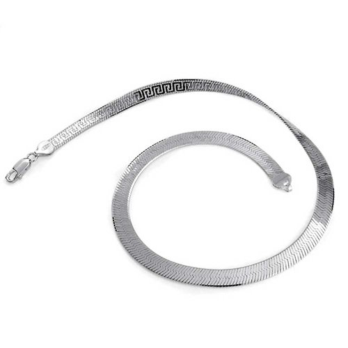 Versatile, dressy, and in demand. This Necklace is made of solid .925 Sterling Silver. Its elegant, dainty appearance is achieved by its herringbone design, known for its delicate texture and supreme comfort while preserving a natural shimmer. This piece boasts a striking Greek key tile design throughout its remarkable length on one side and a sleek classic look on the other, making this reversible necklace a perfect go to chain for any occasion. A lobster claw clasp ensures maximum functionality without sacrificing style. Go for beautiful without going for broke. Go for Greek.Feature