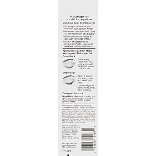 Helps define and brighten your eyes with Neutrogena Nourishing Eyeliner. Rich, luminous color glides on smoothly to enhance eyes all day without smudging or fading. Subtle light diffusers make whites of eyes appear whiter, while olive oil and rainforest shea butter add nourishment. The built-in sharpener allows for precise application and definition, and the contoured smudger helps you achieve a soft, blended look. This dermatologist- and ophthalmologist-tested eyeliner is safe for sensitive eyes and contact lens wearers, and removes easily with Neutrogena Oil-Free Makeup Remover.Feature