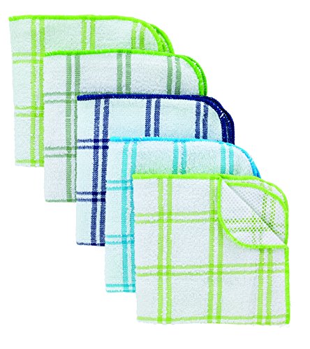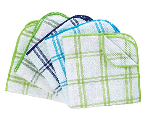5-piece check cotton dish cloths with poly scour side in blues and greens