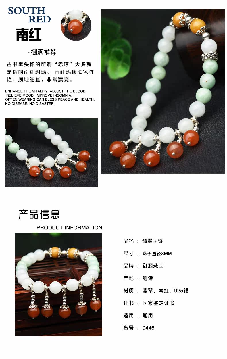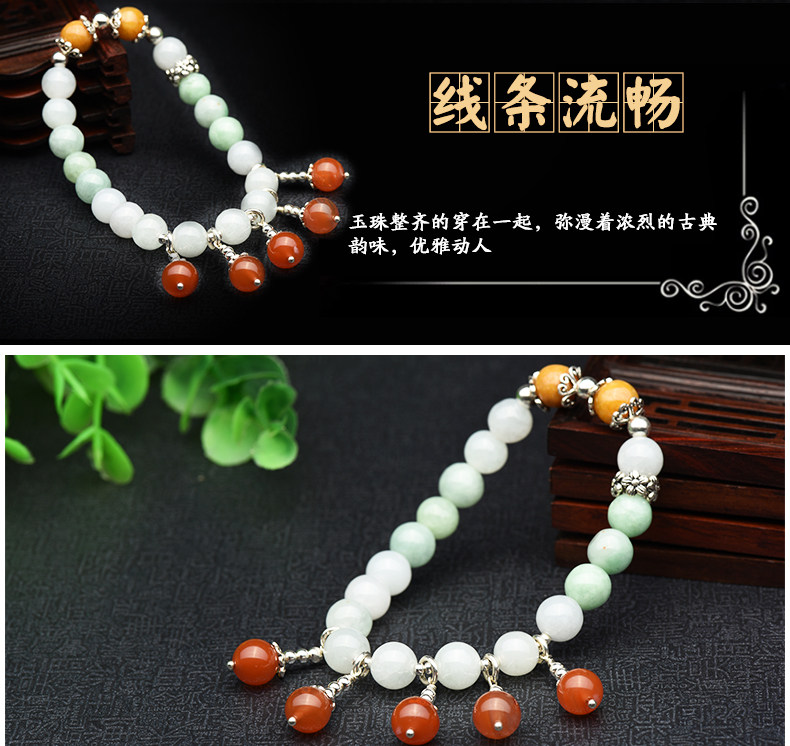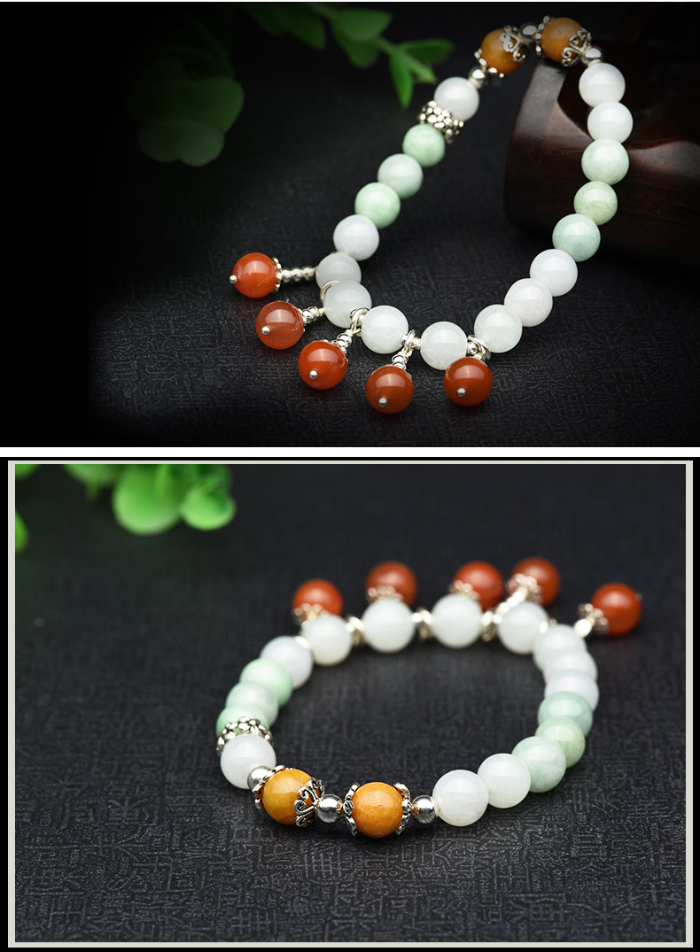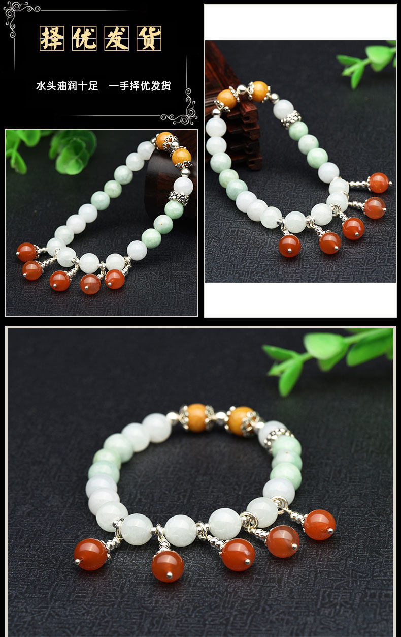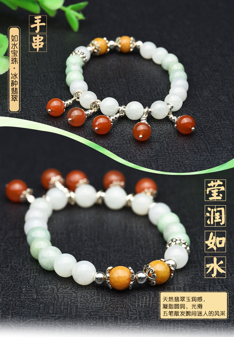 冰种翡翠手链女款 三彩阳绿圆珠玉手串S925银佩南红玛瑙手饰