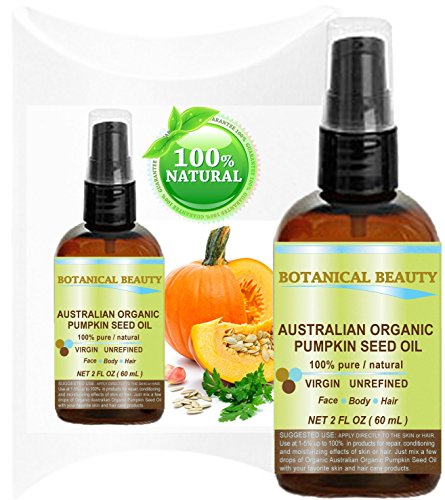 -. Title : ORGANIC PUMPKIN SEED OIL Australian. 100% Pure / Natural / Undiluted /Unrefined Cold Pressed Carrier Oil. 2 Fl.oz.- 60 ml. For Skin, Hair, Lip And Nail Care. "One Of The Richest Sources Of Enzymes, Fatty Acids, Iron, Zinc, Vitamins A, C, E And K". by Botanical Beauty.