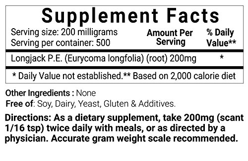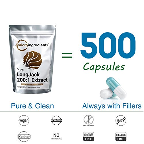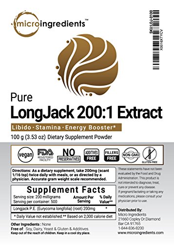Micro Ingredients 200:1 Longjack powder. 100% pure, vegan, no additives or preservatives, fillers free, non-gmo, gluten-free, no artificial colors or flavors.