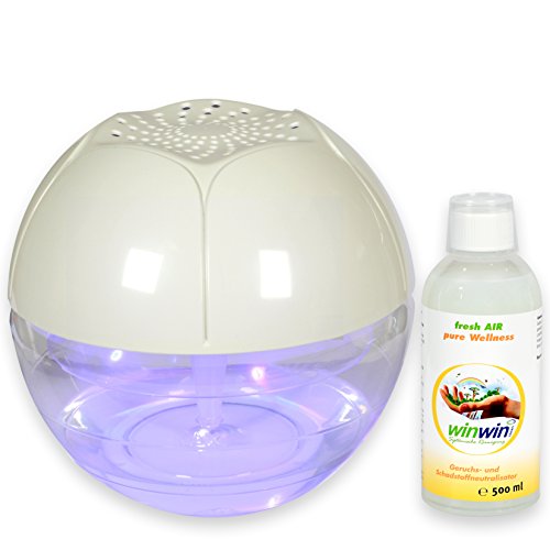 -. Feature : 5 IN 1 FUNKTION - ALLERGIKER GEEIGNET - Luftreiniger, Luftbefeuchter, Aroma Diffuser, Entkeimer und Deko-Element in einem Gerät. / GERUCHS-/SCHADSTOFFBESEITIGUNG - Verunreinigte Raumluft wird durch den winwinCLEAN "AIR Blow" angesaugt. Die Schadstoffe werden durch die reinigende Filterwirkung von Wasser und winwinCLEAN "fresh AIR" gebunden. Die angesaugte Raumluft wird gereinigt und aromatisiert wieder in den Raum abgebeben. Durch die Verwendung der fresh AIR Luftreinigungskonzentrate werden nicht nur Schadstoffe wie z.B. Formaldehyd,etc. gebunden, sondern es entsteht ein natürlicher Wohlfühlduft. / DEKO-OBJEKT - Im Hochglanz lackierten Oberteil sind hochwertige LED`s verbaut, die laufend den Farbton wechseln. Gerne können Sie Ihren Wunschfarbton auch "fest" einstellen. / UV-ENTKEIMUNG - Durch die eingebauten UV-LED's wird das Wasser im Wasserbehälter zuverlässig entkeimt und somit länger haltbar für den Betrieb. UV-Entkeimung wird in der Wasserverorgung zur zuverlässigen Entkeimung auch von Wasserwerken, etc. eingesetzt. / LEISTUNGSSTARK - 2 separat schaltbare Leistungsstufen 2200/2600 U/min.