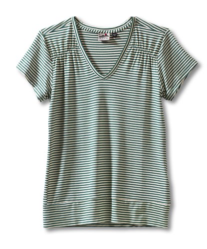 Product DescriptionRelaxed fit short sleeve V-neck tee with waistband and gathering detail on shoulder seams. Fabric: 50% polyester, 50% rayon.0