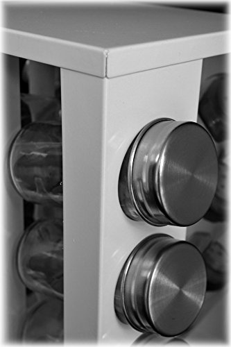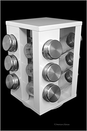 -. Brand : American Chateau -. EAN : 0881490101312 -. Feature : Retro Metal 12-Jar Revolving Spice Rack / Powder Coated Steel with Glass Jars and Stainless Steel Tops / No spices or Tags are included with this set / Countertop or Tabletop / Approximate Size: 9" x 5.5" x 5.5" -. Label : American Chateau -. Manufacturer : American Chateau -. MPN : IT4ND257 -. PartNumber : IT4ND257 -. ProductGroup : Kitchen -. ProductTypeName : KITCHEN -. Publisher : American Chateau -. Studio : American Chateau -. Title : Retro White Revolving Rotating Carousel Spice Rack with 12 Glass Jars Bottles -. UPC : 881490101312