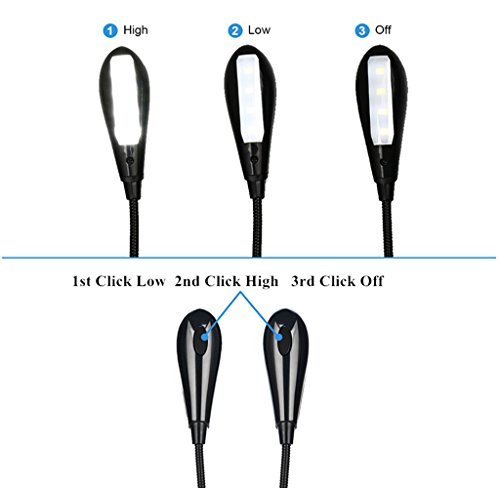- 3 LIGHT MODES - 1 Click: Dimmed light, 2 Clicks: Full brightness, 3 Clicks: Off. The dimmable nature of this LED Clamp-on Light allows the user to select between High and Low levels of light, and the FROSTED COVER, the soft light can protect your eyes from strain while reading in the dark.
