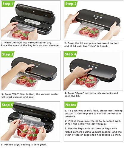 - INNOVATIVE UPGRADES: 1,Effective vacuuming and sealing functions with low noises in working process. 2, Easy-to-handle manual Inching function is suitable for varieties of food, especially for crisp fried food. 3,Intelligent LED indicator lights. 4,Suitable for all vacuum sealer bags and bag rolls up to 12inch wide.