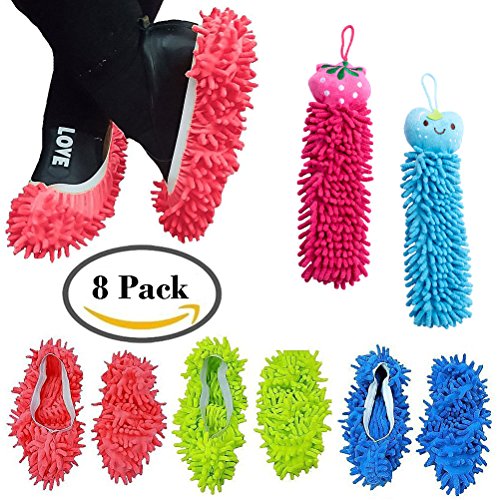 6pcs Mop Slippers Shoes Cover with 2pcs Microfiber Hand Towel Clean Absorbent Cloth, Soft Washable Reusable Chenille Foot Socks Floor Dust Dirt Hair Cleaner for Bathroom Office Kitchen House