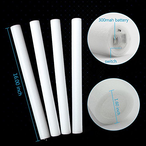 Studio : LifBetter Publisher : LifBetter Binding : Toy Product Description Specifications: Item name: Colorful foam light-up stick Usage: for concert, clubs, nightlife, raves, parties, bachelor/bachelorette parties, weddings, and any other night time event. Feature: 3 model flashing: quick flashing, slow flashing, alternately flashing, turn off. Material: PE Foam Size: 16*1.6 inches/PCS Powered by 3 button batteries(included) 0