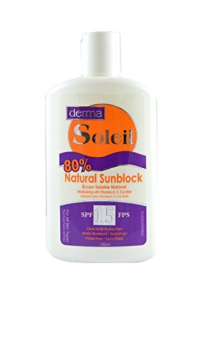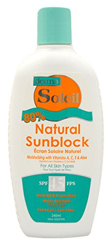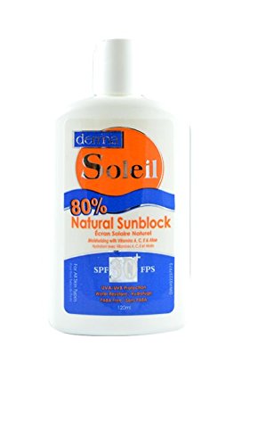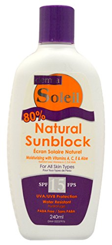 DermaSoleil 80% Natural Adult Sunblock SPF 45 provides up to 45 times your normal skin protection, is water resistant, non-greasy, non-irritating, PABA free, and contains UVA-UVB sunscreens.