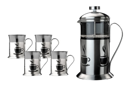 -. Feature : Stainless steel / Glass carafe / Set includes: coffee/tea plunger (32 oz. capacity) and 4 matching glasses (8 oz.) / Imported