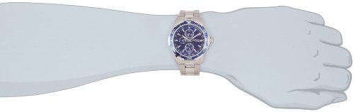 Stainless steel watch with three-link bracelet and blue dial featuring day, date, and 24-hour subdials