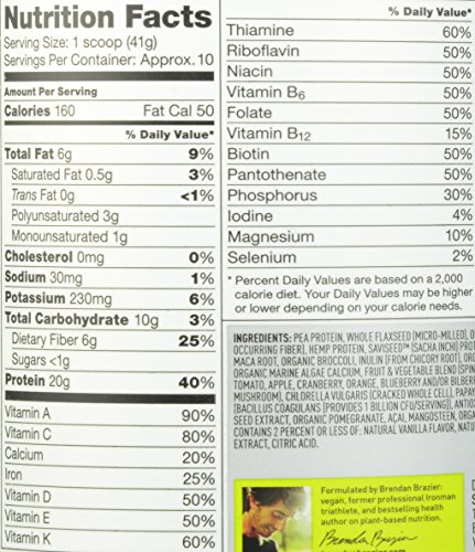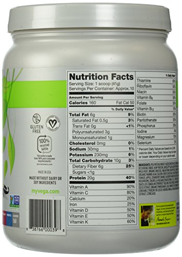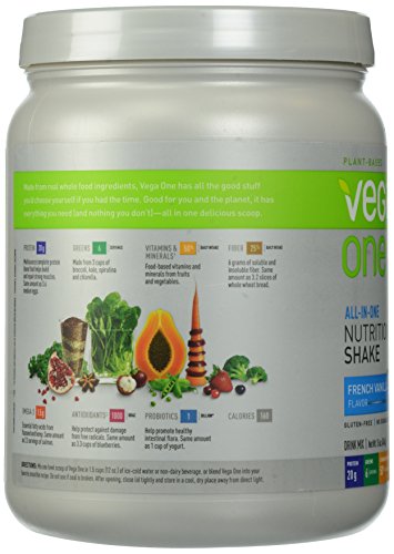 We put the best in so you get the best out. Made from whole food, non-GMO ingredients, Vega One All-in-One Nutritional Shake gives you everything you need-all in one delicious scoop. 20 grams of premium plant-based protein, 6 servings of greens, and 50% daily value of food-based vitamins and minerals made from fruits and vegetables, plus fiber, Omega-3s, antioxidants and probiotics in each serving of Vega One gives you the nutritional confidence to enjoy your full life-no matter how much you pack in. Vega One is Non-GMO Project verified, vegan certified, low-glycemic, gluten-free and made without dairy or soy ingredients. Enjoy Vega One in French Vanilla, Chocolate, Berry, Vanilla Chai or Natural flavors.Feature