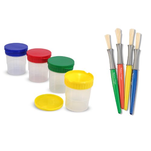-. Binding : Product Bundle -. Feature : The colorful lids help identify the paint content and snap on tightly for an air-tight seal / Paint containers and lids are dishwasher safe / Brush set contains four brushes with easy-to-grasp handles and high quality bristles / Brush handles match the paint container lids for easy identification / Brushes store in a plastic pouch -. ProductGroup : Toy -. ProductTypeName : TOYS_AND_GAMES -. Title : Spill Proof Paint Melissa & Doug Cups and Large Paintbrushes