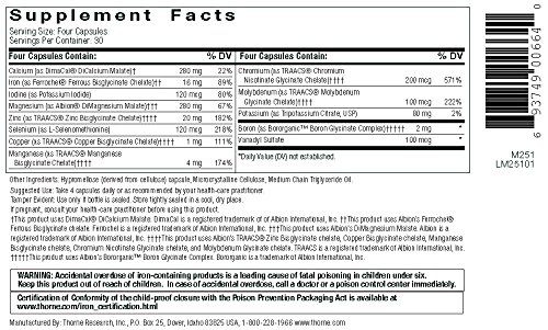 Studio : Thorne Research Publisher : Thorne Research Binding : Health and Beauty Product Description A comprehensive multi-mineral formula with copper and iron. Who should be taking a multiple mineral? Individuals at high risk for mineral deficiencies include the elderly due to deteriorating digestion, children and teenagers because of poor diet, individuals with eating disorders, and anyone suffering from a chronic disease. Taking certain prescription medications can also result in a mineral deficiency. Because the mineral content in fruits and vegetables depends on the soil the crop is grown in, even a healthy individual who maintains a good diet can be at risk for a mineral deficiency because of mineral-depleted soil. Since 1984, Thorne has set the standard for the exceptional formulation and quality manufacturing of nutritional supplements. Thorne delivers premium, science-based products, a health diagnostics technology platform, and the latest in medical education. With more than 350 products, Thorne is the most dispensed brand by 30-40 year old health-care practitioners. Thorne is dedicated to improving the health of our community as well as increasing the knowledge of nutritional health and wellness. Since 2012, Thorne has partnered with educational institutes and local charities to donate more than $1M in products and profits. Thorne products do not contain any unnecessary binders, coatings, disintegrants, fillers, or lubricants (including magnesium stearate) that could impair absorption. Thorne adheres to the FDA's current Good Manufacturing Practices (cGMPs) and has the highest number of NSF Certified for Sport products which tests for more than 200 banned substances for elite athletic competitions. 0