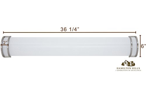Are you looking to add that clean stylish contemporary look to your vanity or bathrooms, without spending a fortune? Our beautiful flush mounted frosted curved rectangular bar and brushed nickel wall sconce light is perfect for bathrooms, hallways, offices, or kitchen accents both horizontally or vertically. A beautiful warm light separates us from the cheaper alternatives. A warm yellowish light comes from the bright 2000 Lumens 3000K LED lights inside. A safe non-break frosted acrylic defuser hides the lights and looks like frosted glass when hung without the safety concerns. Suitable for damp locations. Our light comes with the required hardware for hanging or wall mounting and can be hung or mounted horizontally or vertically. Both ETL & cETL certified for both the US and Canada our light is the perfect, no hassle maintenance free LED fixture. Compatible with standard LED dimmers. We stand by our products and your happiness with a 100% money back guarantee. USA Company with 3 Generations of Family Values.Feature