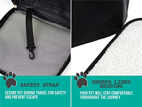 - Your Pet will Travel in Comfort – Well ventilated design for optimal airflow and checking on pet, soft cozy sherpa lining bedding so your pet can relax and rest, collapsible bowl to keep your pet hydrated during travel