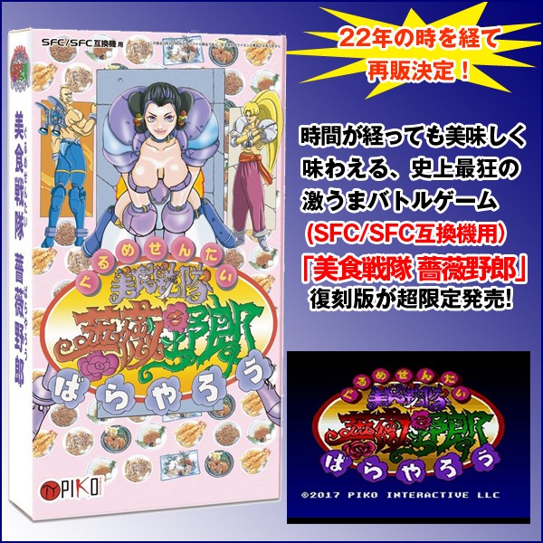プレイヤーは魔天都市「ゼウス」の首脳陣が作り上げた3人の改造人間「薔薇野郎」となって、悪の秘密組織「バース」を壊滅させるべく戦います。襲いくる個性的な敵たちを個性的な技の数々で蹴散らしていきましょう。本作は2人同時プレイも可能。協力して戦えば、ステージ攻略もグッと楽になります。なお、このゲームには残機も1UPもありません。道中で手に入れた食材の数々を組み合わせ、「サイバーシェフ」にライフが回復する料理を作ってもらいましょう。攻略するには作る料理も重要なのがこのゲームの特徴です。
