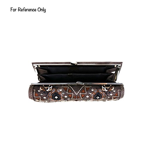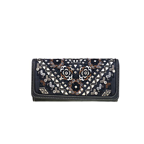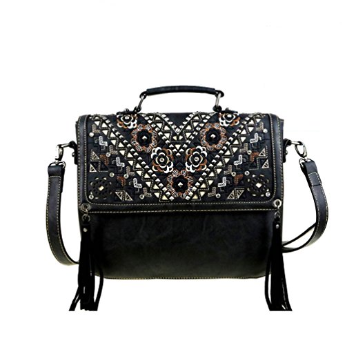 -. Brand : Montana West -. Department : womens -. Feature : Medium large satchel constructed with PU Leather / cut-out tribal pattern with matching color inlay / embroidered floral with antique rivets and crystal studs / flap with tassels and magnetic closure / Main zippered enclosure divided into two parts by a full length zippered pocket / small zippered pocket on one side and 2 open pockets on the other / Concealment pocket measures 9.5" W x 5.5" H / right vertical access / patent protected design/ doesn't require a holster / Matching wallet has multiple credit card slots, two bill pockets, a spilt coin pocket on the back with twist snap closure / Purse Dimensions: 13" x 4" x 10" (Handle 7" L Drop - 1.5") (Adjustable strap 42"- 48") / Wallet Dimensions: 7.5" x 4.5" -. ProductGroup : Shoes -. ProductTypeName : HANDBAG -. Size : Medium Large -. Title : Concealed Carry Crossbody Satchel with Matching Wallet by Montana West