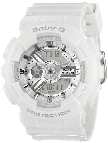 Casio Baby-G is growing up with a new collection of timepieces inspired by its analog and digitally-dynamite "big brother," the XL GA110 G-Shock. The BA110 model(s) feature a lightweight, glossy resin band in two fashionable hues of black and white casting a spotlight on the large watch face brushed in striking gold and rose gold metallic. The BA110 is equipped with a layered 3D metallic face, along with gear motif hands, which nod to the sophisticated styling cues of industrial design. Women can bring class to work with the white/rose gold, white/silver, silver/silver and clock out to take on the night with the black/gold. White resin band analog and digital watch with metallic silver face.