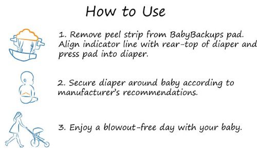 BabyBackups stop up-the-back diaper blowouts, period! Anyone who has experienced a diaper blowout knows how awful it is to deal with, especially if it happens in the car or a public place. Cleanup may be as simple as changing your precious little one's diaper and clothes, or as extensive as buying a new outfit and steam cleaning everything around the epicenter of the incident. Either way, it's unpleasant and something that should be avoided if at all possible. BabyBackups are the best solution for keeping your number one priority's "number two" exactly where it should be. While other products trap the mess between the baby's skin and the product, BabyBackups eliminate messy cleanups and embarrassing situations by keeping liquid where it belongs, in the diaper. BabyBackups are a hypoallergenic pad that can be used with any diaper brand, fitting snugly between the waistband of the diaper and the baby's back. Simply peel off the adhesive strip cover, press the pad into the diaper, and secure the diaper around the baby. BabyBackups even include a blue alignment line to help ensure they are placed quickly and effectively to contain blowouts each and every time. Use them on your newborn up through 12 months old. Whether at home or on the go, protect against diaper blowouts with BabyBackups. Buy 2 or more and get 20% off your order! When is the best time to use BabyBackups? Whenever you need peace of mind. Maybe when you're taking a flight to see some friends and don't want to have to deal with a messy outfit change on the plane. Or maybe for your daughter's baptism when she's wearing that beautiful white dress. Or it could be on that long car ride - because cleaning a car seat is not fun. Or it might simply be when you lay your little guy down at night so that you're not waking up to a crib full of poo. You barely sleep as it is, make life a little easier on yourself and use BabyBackups.Feature