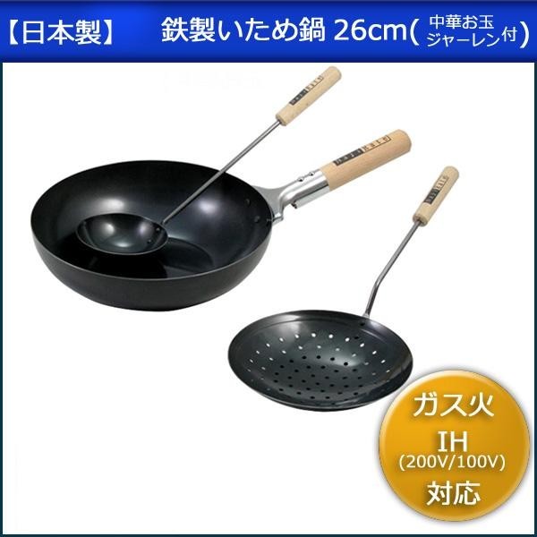 | 油なじみが良く、高温調理に優れた鉄製いため鍋です。炒め物をかき混ぜたり、盛り付けに便利な中華お玉と、「油通し」や「湯通し」に便利なジャーレン付き!! |