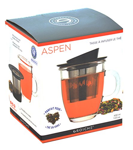 THE GROSCHE ASPEN TEA INFUSER MUG The Aspen is the perfect glass infuser mug for making your steeped loose leaf tea. It is made from borosilicate, heat-resistant glass, includes an 18-8 stainless steel infuser and glass cover. The cover is perfect for keeping your tea warm and also doubles as a holder or trivet for your loose leaf tea infuser when your tea is done steeping. The Aspen is perfect for all loose leaf teas