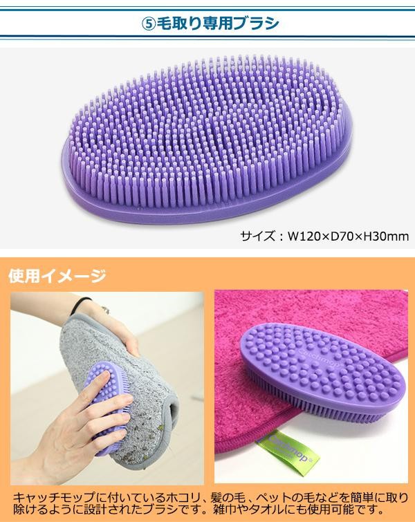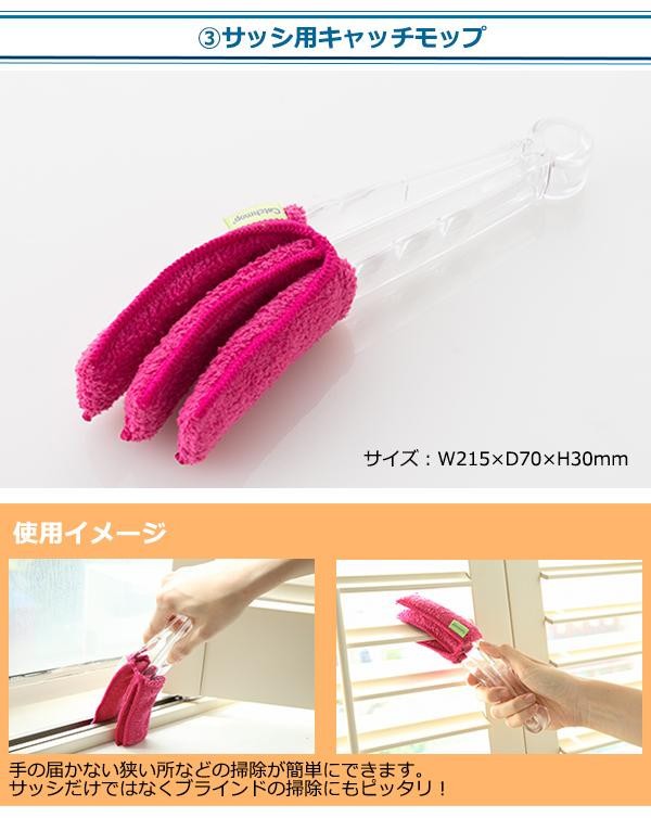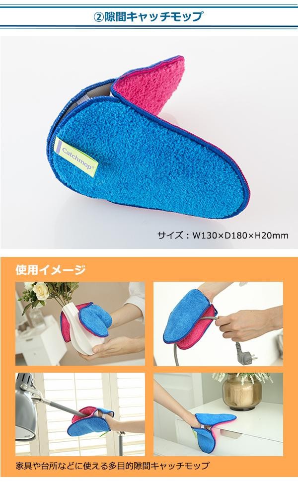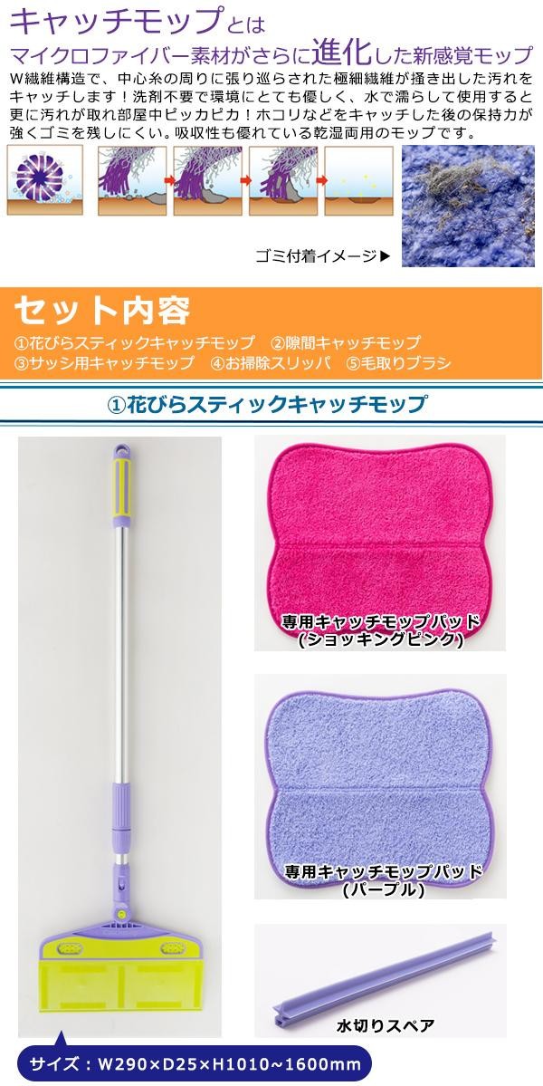 | セット内容 | ●花びらスティックキャッチモップ(本体、専用キャッチモップパッド×2枚、水切りスペア) ●隙間キャッチモップ ●サッシ用キャッチモップ ●お掃除スリッパ ●毛取り専用ブラシ ●取扱説明書 |
