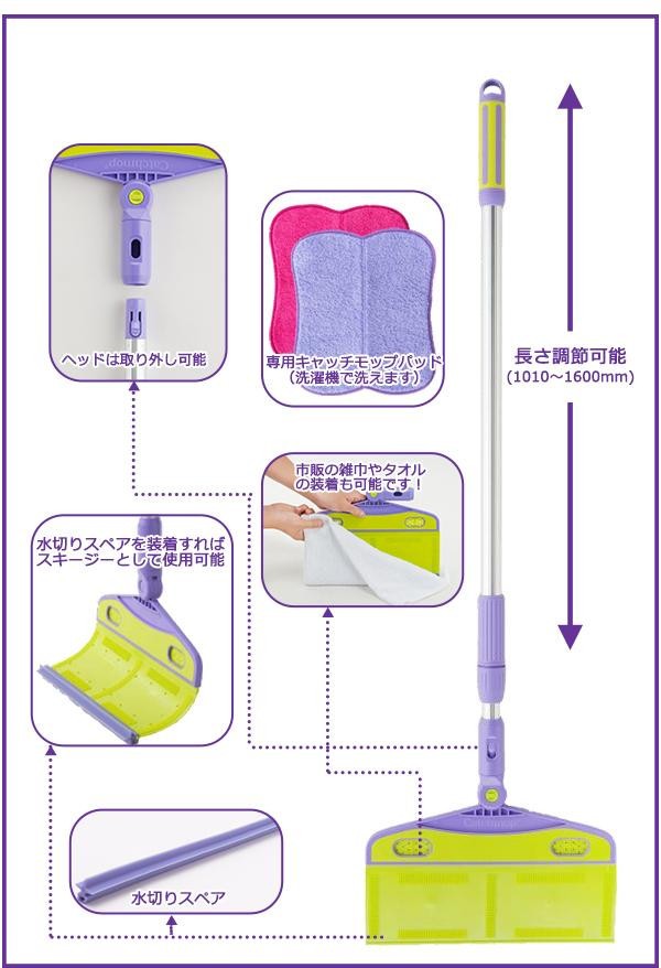 | キャッチモップはマイクロファイバー素材がさらに進化した新感覚モップ!!W繊維構造で、中心糸の周りに張り巡らされた極細繊維が掻き出した汚れをキャッチ!!ホコリなどをキャッチした後の保持力が強く、ゴミが残りにくくなっています。水に濡らして使用すると更に汚れが取れ部屋中ピッカピカ★吸収性も優れている乾湿両用のモップです!! |