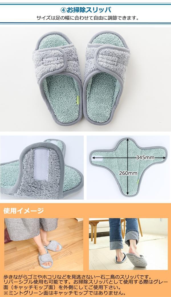 | 重量 | 花びらスティックキャッチモップ:約550g、隙間キャッチモップ:約30g、サッシ用キャッチモップ:約80g、お掃除スリッパ(両足):約145g、毛取りブラシ:約100g 個装重量:1300g |