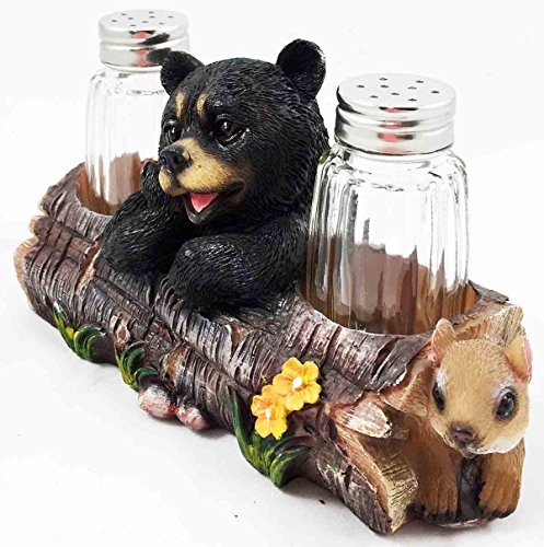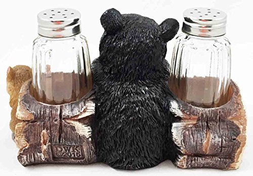 Black Baby Bear Playing With Log Figurine Salt Pepper Shakers Holder Stand Dining Table Centerpiece