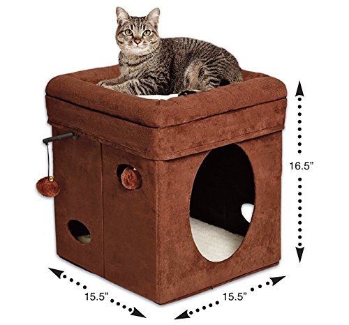 -. Feature : Curious Cat Cube, cat condo / cat house measures 15.5"W x 15.5"L x 16.5"H when set-up / Strong / sturdy construction, cat hide-out collapses flat when not in use for easy storage and travel / Cat hide-away includes two hanging jingle balls to promote play, a nice P.R.Ivate den creates a fun cat hide-out and a comfortable cushioned top promotes relaxation for your pet cat. / Curious Cat Cube, cat house / cat condo is a great retreat for cats and small dogs / Brown faux suede w/ fleece bed topper helps the cat condo look great in any home décor