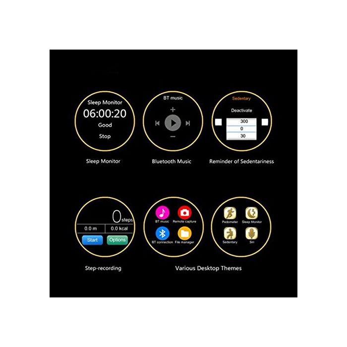 다기능: 보수계-페도미터,심박계,수면계,착신 전화 통지(Email,Gmail의 착신이 표시되지 되어 있습니다 선)고, 리모트 카메라 촬영,장좌주의,분실 통지,SMS통지,자명종 통지,시간표시,휴대 찾기,데이터 동기,운동 데이터 분석.
