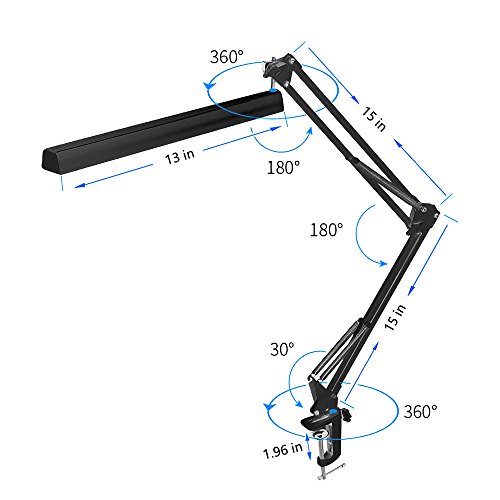 180°swivel lamp head, 15+15 inches adjustable metal arm, rotatable body. Strong clamp supports up to 2 inches tabletop.