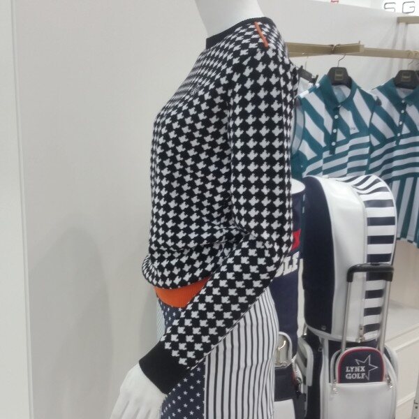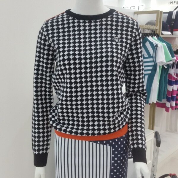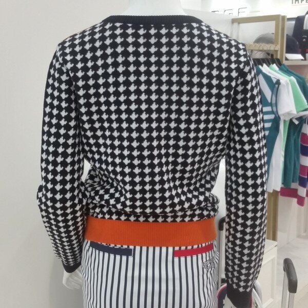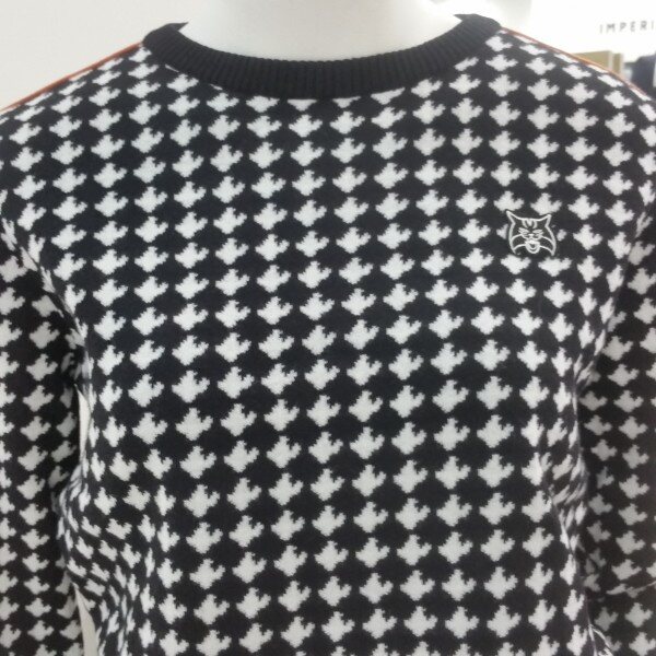링스시라소니캐릭터로하운드체크패턴의디자인라운드 니트티입니다.