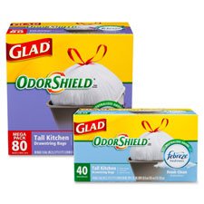 -. Feature : Neutralize kitchen trash odors with Glad OdorShield Bags with Febreze Freshness / Glad OdorShield technology provides all-day odor neutralization and freshness / Innovative reinforcing bands mean it's stronger and uses less plastic / When the bag is full, one quick pull of the sturdy, three-layer drawstring, and it's closed / Grab it by the handles, toss it away with ease and leave nothing behind but a fresh clean scent