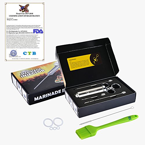 - 【FDA Kitchen/BBQ Tool=100% Safe & Healthy】food-grade 304 stainless steel for meat injector barrel/syringe plunger/meat needles; BPA-free and FDA silicone for BBQ brush and O-ring seals; 100% food safe for parts touching marinade/food ingredients, to keep your family safe and healthy.
